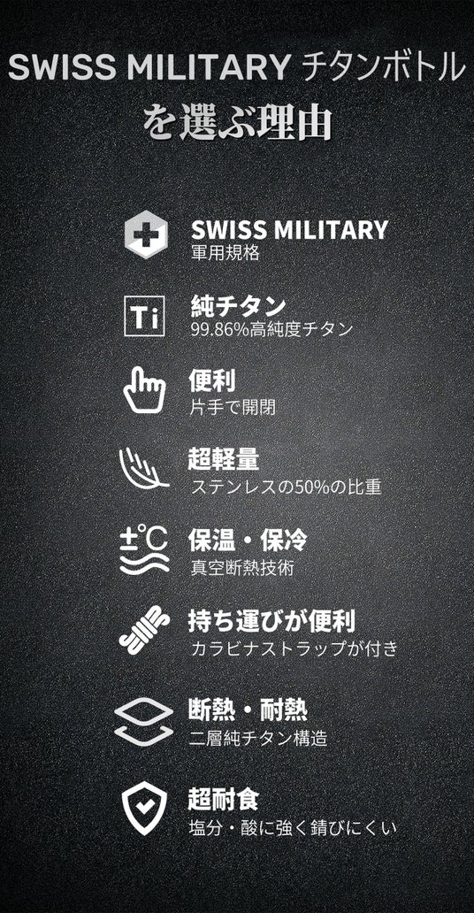 SWISS MILITARYは、スイスを代表する高品質ブランドです。軍用グレードの耐久性と機能性を追求し、過酷な環境下でも使用できる製品を提供しています。スイスの伝統的な職人技術と現代的なデザインを融合させ、時計、アウトドア用品、バッグ、衣類など、多岐にわたる製品を展開しています。今回ご紹介するSWISS MILITARY純チタン六角形ボトルは、SWISS MILITARYの技術と品質を活かした製品です。