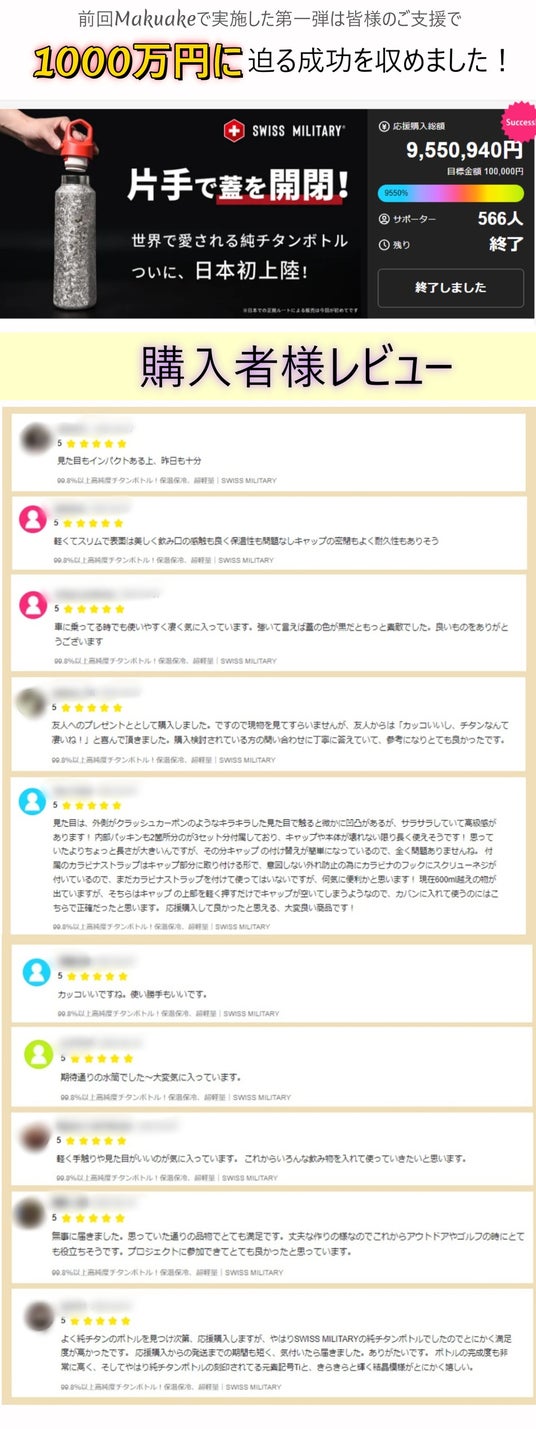 第二弾のSWISS MILITARY高純度チタンボトルは本日より販売開始いたしました!https://www.makuake.com/project/swiss_military_bottle_2/