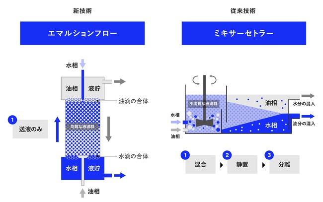 エマルションフローは原子力機構の使用済み核燃料に含まれる元素を高度分離する研究過程で生まれた溶媒抽出法の一つであり、液相どうしを混ぜる・置く・分離するの3工程を必要とする従来の溶媒抽出技術に対して、送液のみの1工程で理想的な溶媒抽出を可能とする革新的手法です。