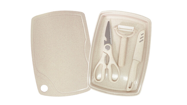 まな板と調理ツール、収納トレーが一体化した「5in1キッチンツールセット」や