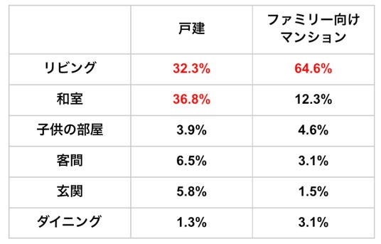 戸建はリビング・和室がそれぞれ3割台だったのに対し、ファミリー向けマンションではリビングが6割以上を占めて圧倒的に多く、和室はわずか約1割にとどまっていました。マンションでは和室がないタイプがあったり、和室があっても小さめであったり、和室の一部屋としての独立度が低い(他の部屋とつなげて使っている等)ことが影響していると考えられます。