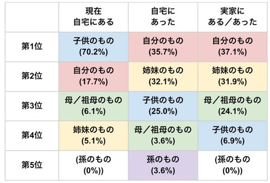 一方、「自宅にあった」場合と「実家にある/あった」場合については、両方とも「自分のもの」が4割弱・「姉妹のもの」が3割強でした。