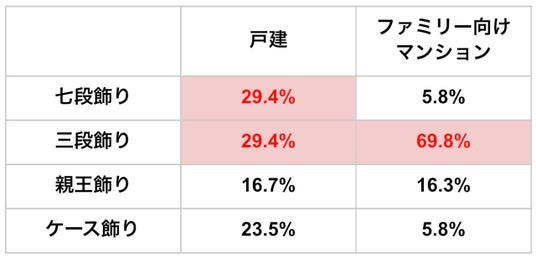 戸建では七段飾り・三段飾りがどちらも同率で約3割でしたが、ファミリー向けマンションでは三段飾りが約7割にのぼり、七段飾りはわずか1割弱でした。