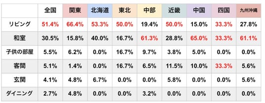 (四国はリビング・和室・客間が同率)