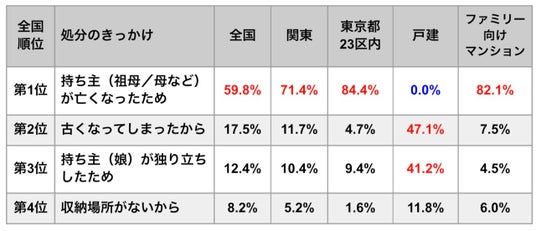 処分したきっかけの第1位は「持ち主(祖母/母など)が亡くなったため(59.8%)」でした。