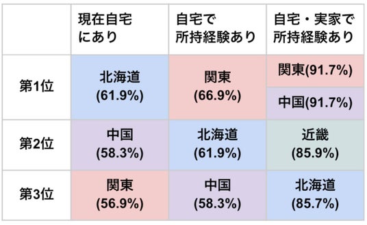 【雛飾りの所持率(自宅・実家/現在・所持経験)が高い地方トップ3】