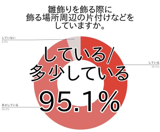 アンケートでは雛飾りを飾る場所周辺の片付けなどをしている・多少していると答えた方は9割以上(全国95.1%・関東97.2%)でした。