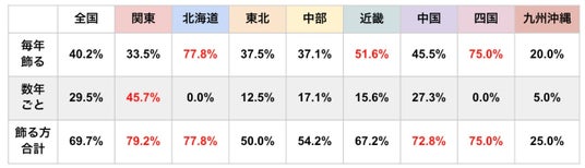 「飾るスペースを確保」と答えた方の割合が高かったのは近畿地方(91.8%)・中国地方(85.0%)・中部地方(83.3%)でした。また「家具等を移動させる」は関東地方(49.3%)で特に高く、約半数が家具移動など多少のレイアウト変更をしていることがわかりました。