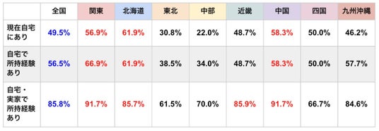 関東地方は「現在自宅にあり」と「自宅で所持経験あり」の差は10%で、関東地方では雛飾りが以前自宅にあったけれど処分などして現在ないケースが多いことが特徴的でした。