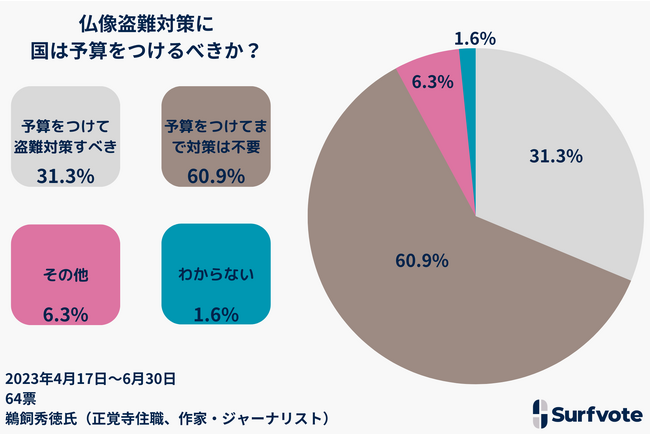 SNSとテクノロジーで社会課題の発見・解決をサポートするICTスタートアップのPolimill株式会社(ポリミル、本社:東京都港区、代表取締役:横田えり、以下Polimill社)は、Surfvoteオーサー鵜飼秀徳氏が提起したイシュー(課題)「仏像盗難対策に、国は予算をつけるべきか?」の投票結果をお知らせします。