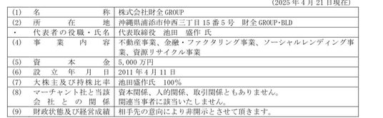 2025 年4 月21 日付で当社取締役会承認のうえ、同日付で、株式会社財全GROUP と業務提携契約 書を締結いたします。