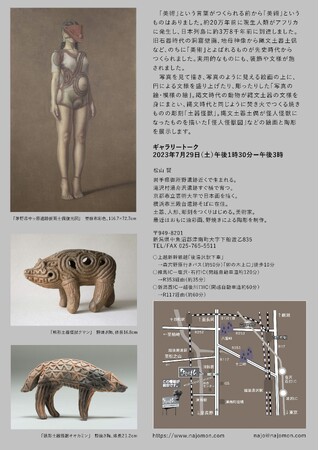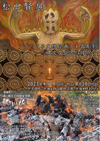 写真を見て描き、写真のように見える絵画の上に、円による文様を盛り上げたり、彫ったりした「写真の絵・模様の絵」。縄文時代の動物が縄文土器の文様を身にまとい、縄文時代と同じように焚き火でつくる焼きものの彫刻「土器怪獣」。縄文土器土偶が怪人怪獣になったものを描いた「怪人怪獣図」などの絵画と陶彫を展示します。