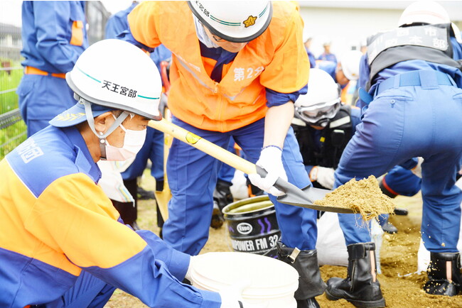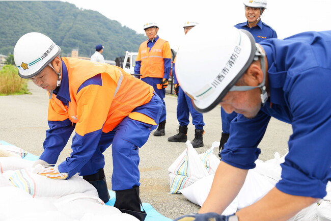 訓練では、指揮者の指示に基づき、参加者約100名の消防職員や消防団員などが共同で人力による土のう約360袋を作製。その後、土のう搬送訓練や、越水危険範囲約15メートルを想定した「3段(ひかえ土のう2段・目土なし)積み土のう工法」を一列完成させた。