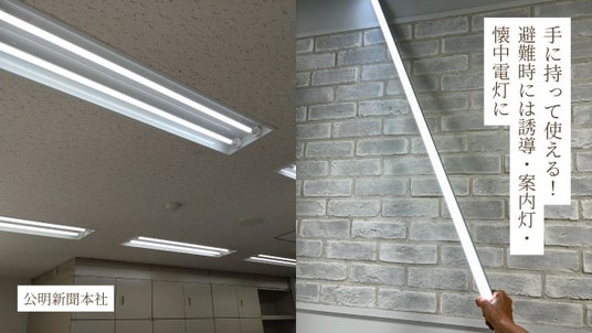 近年、地震や台風などの自然災害が頻発する中、特に報道機関においては災害時こそ確実な情報発信が求められます。公明新聞では、災害時や突発的な停電時でも新聞発行を絶やさない体制と防災対策を強化するため、館内の蛍光灯の一部を「ライトセーバーtsuita」に切り替えました。これにより災害時でも安定的な照明が確保されたほか対蛍光灯比でコスト削減の効果も見込めます。