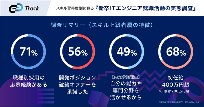 そこで今回、「テクノロジースキルを経営資源に」を理念に多くの人々や組織が創造力(エンジニアリング力)を発揮できる、よりよい未来の実現を目指して活動をしているTrackチームでは、「職種別採用」「配属先確約」「個別オファー制度」がエンジニア職志望学生に与える影響や、プログラミングスキルの習得度が就職活動にどのような影響を及ぼすかを明らかにすべく、2023年卒業予定のエンジニア職志望学生350名を対象に、就職活動に関する調査を実施いたしました。回答者のプログラミングスキルに応じて、初級・中級・上級の3階層にデータを分類し、新卒ITエンジニアの動向や嗜好をスキル習得度別にまとめています。