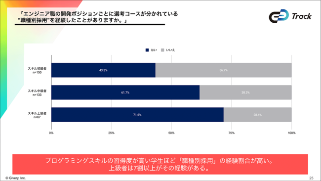 スキル上級者は、職種別採用の経験割合が71%と初級者や中級者と比較して高い結果に。スキルの習得度が高い学生ほど、「職種別採用」の経験割合が高いです。