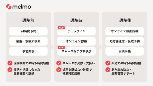 メドレーでは、病院・有床診療所、無床医科診療所、歯科診療所、調剤薬局の各領域で医療機関向けに業務効率化やデジタル化を推進するプロダクトを展開するとともに、医療機関と患者の接点となるアプリ「CLINICS(クリニクス)」を提供してきました。今回、対面での体験も含めて、いつもの医療を変えていくアプリ「melmo」としてリニューアルします。