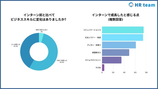アンケート結果では、回答者の95%以上がインターンシップを通じてビジネススキルが「大きく成長した」または「少し成長した」と回答しており、特に「コミュニケーション力」、「社会人マナー・敬語」、「プレゼン・営業力」といった対人スキルや基本的なビジネススキルの向上が顕著です。