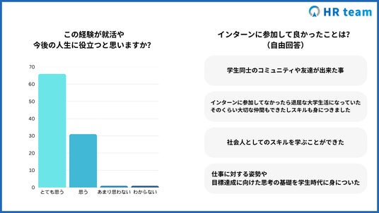 約7割の学生がこの経験が就職活動や今後の人生に「とても役立つ」と回答しており、インターンシップが彼らのキャリア形成において重要な役割を果たしていることが示されています。