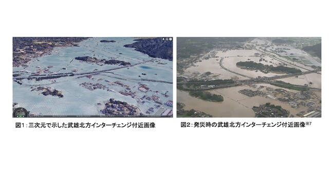図1は、2019年8月豪雨に伴う、衛星データとSNS情報を重畳したシステム画面を示しています。同豪雨の際国土交通省が公開した有明海沿岸道路の武雄北方インターチェンジの浸水被害の写真(図2)と比較すると、被害状況の高い再現性※6、視認性が確認できます。