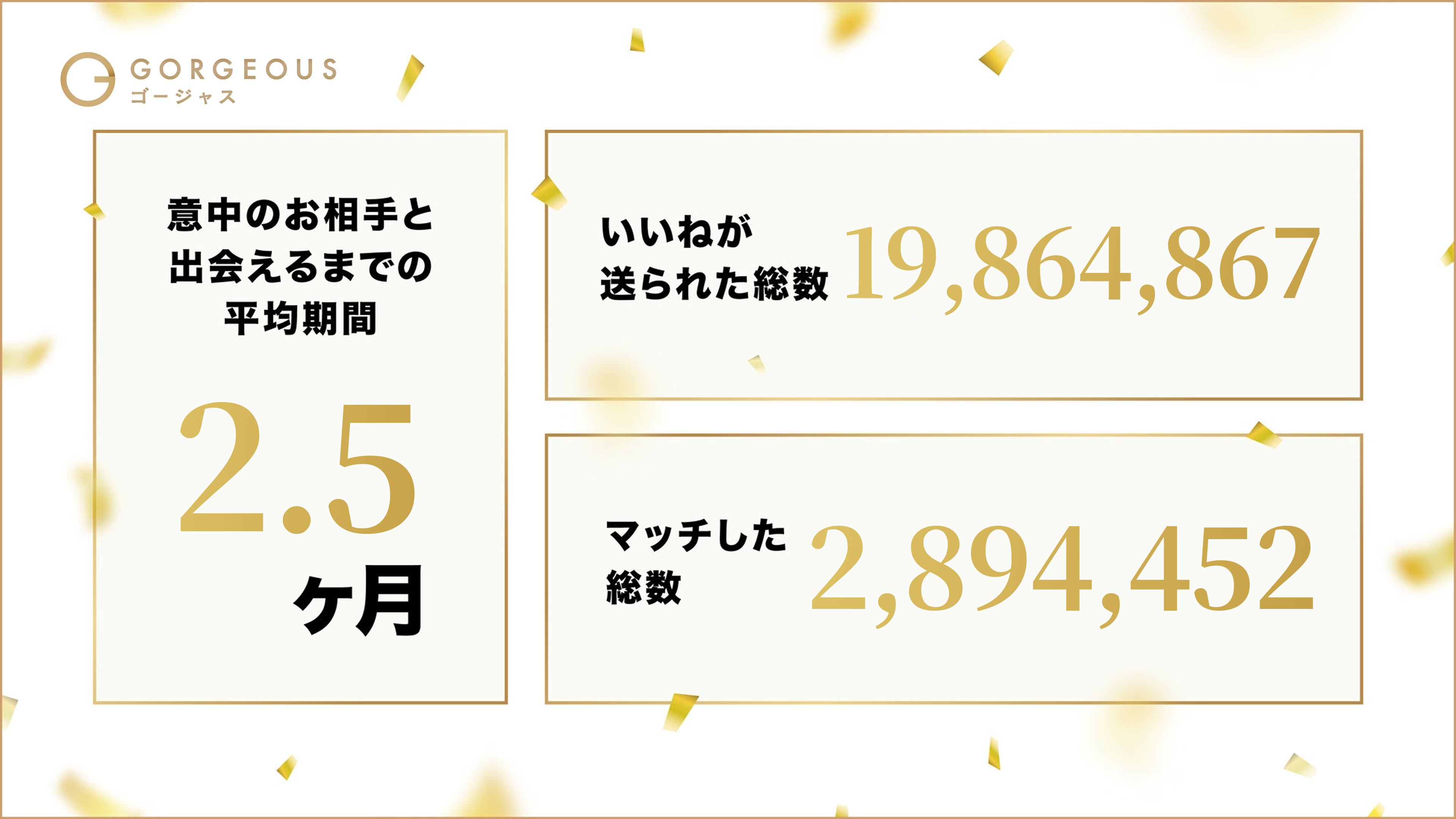 - ゴージャスでいいねが送られた総数は、昨年の約670万件から約3倍に増加し、現在では19,864,867件に!マッチした総数も約3倍の2,894,452件と、ハイクラスな出会いの場として、さらに広がりをみせています。