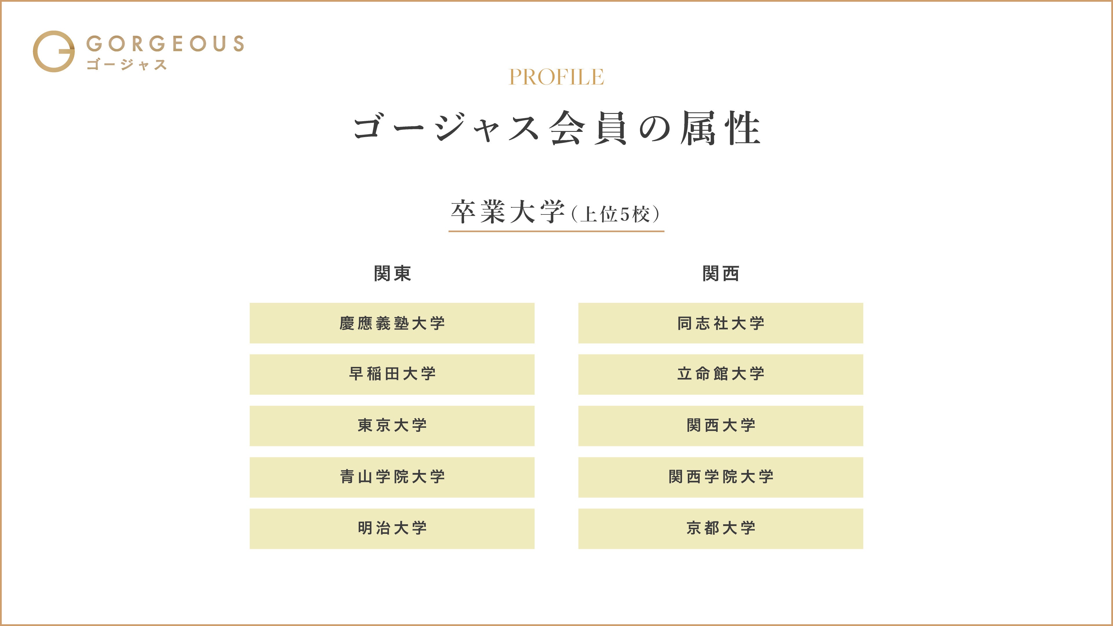 - 出身大学を見ると、関東エリアでは慶應義塾大学、早稲田大学、東京大学、関西エリアでは同志社大学、立命館大学、関西大学が上位を占め、いずれの地域も主要大学出身者が多く、ハイクラスな会員が集っているようです。