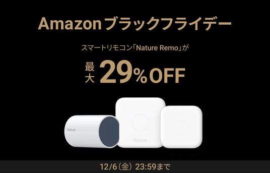 「自然との共生をドライブする」をミッションに掲げるNature株式会社(代表取締役:塩出 晴海 所在地:神奈川県横浜市、以下「Nature」)は、2024年11月27日(水)00:00から2024年12月6日(金)23:59まで、Amazon「ブラックフライデー」及び「ブラックフライデー先行セール」にて、スマートリモコン「Nature Remo」シリーズとスマホHEMS「Nature Remo E」が最大で29%OFFとなる特別セールを実施いたします。