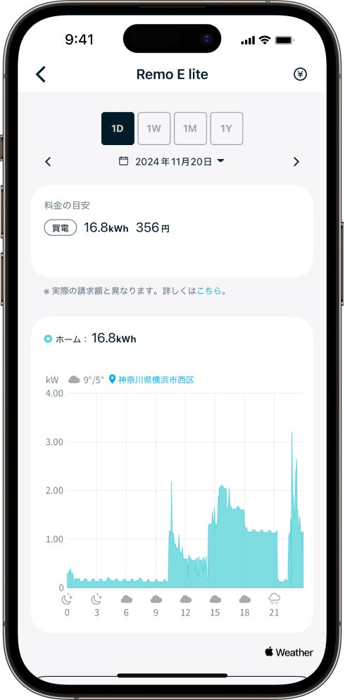 電気使用量を把握、日々の節電に生かす日、週、月、年ごとにグラフで比較することもできる電力モニタリングシステム「Nature Remo E lite」では、リアルタイムに電力消費量が確認できるので、どの家電を使うとどのくらいの電気を消費するのか知ることができ、日々の節電、省エネ活動の参考になります。