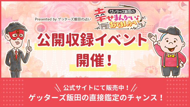 株式会社CAM(本社:東京都渋谷区、代表取締役社長:須田瞬海、以下CAM)は、運営するゲッターズ飯田の公式占いサイト「ゲッターズ飯田の占い」において限定配信を行っているwebラジオ「幸せまんかい♪おくまんかい」の観覧チケットの先行販売を開始したことをお知らせいたします。普段は見ることができない番組の収録風景を生で観覧できるほか、紹介者しか占わないことから”幻の鑑定”とも言われている、ゲッターズ飯田さんの直接鑑定も予定しております。