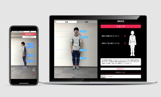 iPad、iPhone内蔵カメラでのモーションキャプチャを元に、AIで姿勢と動作の分析を行う最新アプリです。身体の歪みや部位の問題点だけでなく、将来の姿勢予測・リスクまで分析します。対策としておすすめのトレーニング法を膨大なメニューから自動生成し、数秒で提供可能です。