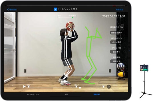 搭載の「お手本動作(16競技135動作)」と自らの動作との差を確認し、その前後動作も比較する事で上達を実感。課題を可視化し改善へ導く未来型のトレーニングツールです。