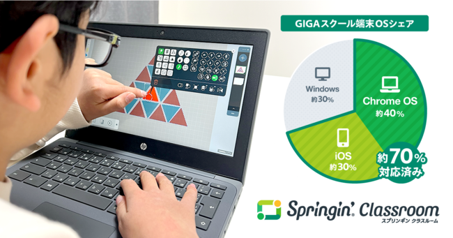 さらに、GIGA スクール構想により配備された ICT端末のOSシェアはChromebook対応が全体の40%を超えている状況から (※)、iOS、Android に加えて、Chromebook にも対応した Springin’ Classroom を提供いたします。