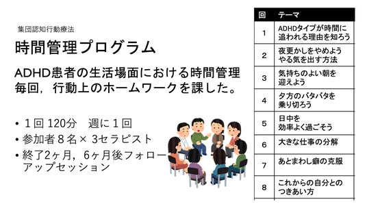 肥前精神医療センターでは、2017年より成人期ADHD患者を対象に集団認知行動療法の臨床試験を実施してきました。週に1度120分間セラピスト2名と8名の参加者でグループセッションをもち、「先延ばしにしていた部屋の片付けの計画を立てて実施する」「朝起きてからでかけるまでにルーチンを見直して実践する」など、行動上のホームワークを課すことでCAARS A SCOREの低減を図り、グループ終了直後だけでなく6ヶ月後まで効果が維持されました。しかし、グループ終了から5年後には、CAARS A SCOREのスコアが介入前の数値とほど同等となっており、効果が消失していました。 そこで、チーム制習慣化アプリ「みんチャレ」を活用し、最初の8週間は集団CBTで行っていた時間管理スキルを用いた行動課題を課し、取り組みを撮影した写真の投稿を促したり、お互いに励ましたりしながら、効果の維持を目指しました。