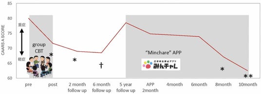 CAARS A SCORE(※3)を経過時間ごとにプロットしたグラフでは、「みんチャレ」の介入効果は、対面で実施する集団CBTほどの急激な効果ではなかったものの、ゆるやかに症状を改善し続け、使用開始10ヶ月後には、集団CBTと同等の効果が得られたことがわかりました。このことから、医療機関で行う対面で実施する集団CBTは通常全6-10回前後で終了することが多いが、その後の効果維持のためのアプリとして活用できる可能性が示されました。