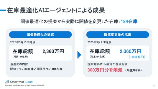 先行導入した株式会社MARUWA SHOMEIでは、2025年5月15日から9月4日の約4か月間で、対象184在庫において在庫総額を2,360万円から2,060万円へと約13%(300万円)削減する成果を実現しています。欠品リスクを抑えながら在庫を圧縮できた点が特徴です。