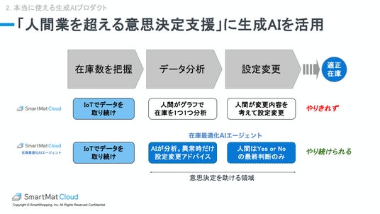 エスマットはこの「人間技ではやりきれない意思決定」の部分にこそ生成AIを使うべきだと考え、「在庫最適化AIエージェント」を開発しました。