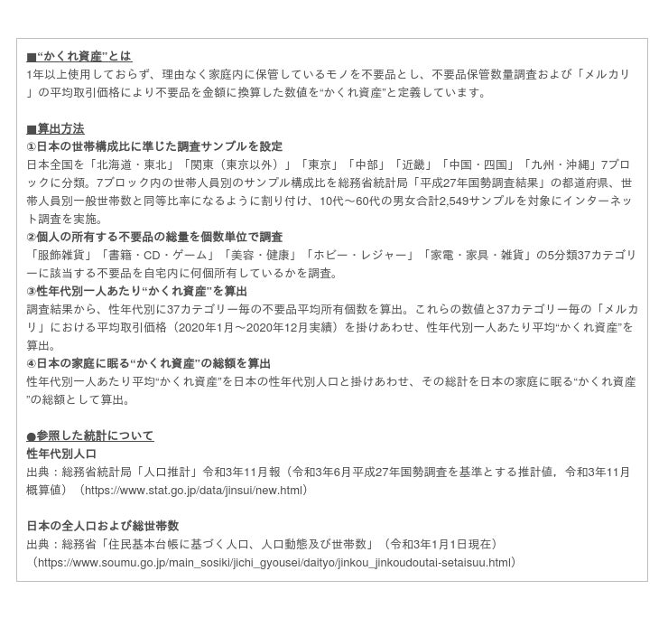 株式会社メルカリ(以下、メルカリ)は、大掃除シーズンに合わせ、ニッセイ基礎研究所 生活研究部 上席研究員 久我 尚子氏監修のもと、「日本の家庭に眠る“かくれ資産”」に関する調査を実施しました。