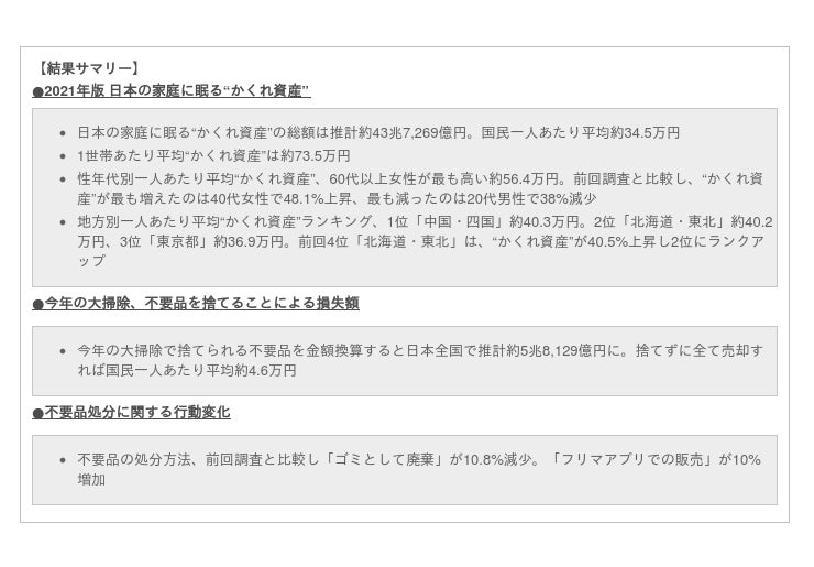 1.日本の家庭に眠る“かくれ資産”の総額は推計約43兆7,269億円。国民一人あたり平均約34.5万円