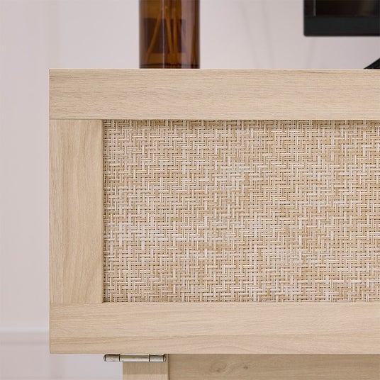 開き扉の前板には、本物の麻ではなくポリ塩化ビニルを使用することで、お手入れも手軽になりました。背面には配線をスムーズに逃がすためのコードスリットやコード逃がし、コード穴を備えているので、壁にピッタリと寄せた状態で配置できます。当社のデザイナーがこだわりをもって完成させたオリジナル商品です。
