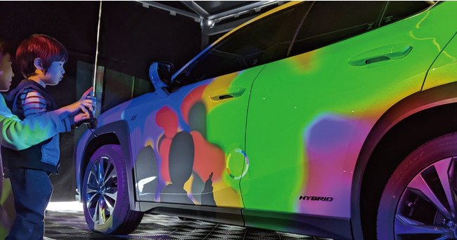 「LEXUSデジタルペイント」では、XR技術を使った特別なスプレーを使って、「LEXUS UX250h “F SPORT”」の車のボディを自由に彩ることができます。缶を振ると色が切り替わり、11色の中から好きな色を使うことが可能です。肉眼でバーチャルスプレーアートが楽しめる「リトルプラネット」のアトラクションをさらに進化させることで、車のボディにスプレーでお絵かきするという“ありえない体験”を実現しました。