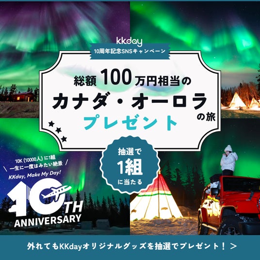 KKdayの公式Xでは、KKday設立10周年を記念して、キャンペーン投稿の引用リポスト数が10K(1万)を達成すると、1組2名様に総額100万円相当のカナダ・オーロラの旅をプレゼントする10周年記念キャンペーンを実施します。またダブルチャンスとして、KKdayオリジナルグッズをプレゼントします。