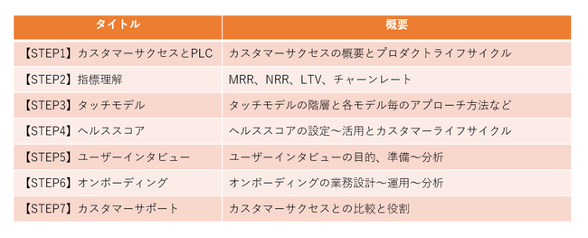 教育内容 :カスタマーサクセスの基本概念から顧客を成功に導く手法の特定、実行できるスキルの習得