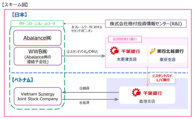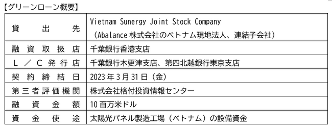 千葉銀行(頭取 米本 努)は、2023年3月31日(金)、Abalance株式会社(本社:東京都品川区、代表取締役社長 光行 康明)の連結子会社でベトナム現地法人であるVietnam Sunergy Joint Stock Company(以下「VSUN」)に対し、Abalance株式会社が設定したグリーンローンフレームワークに基づいたグリーンローンを取り組みましたのでお知らせします。