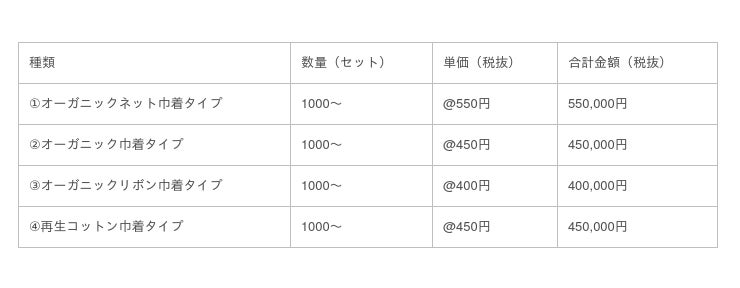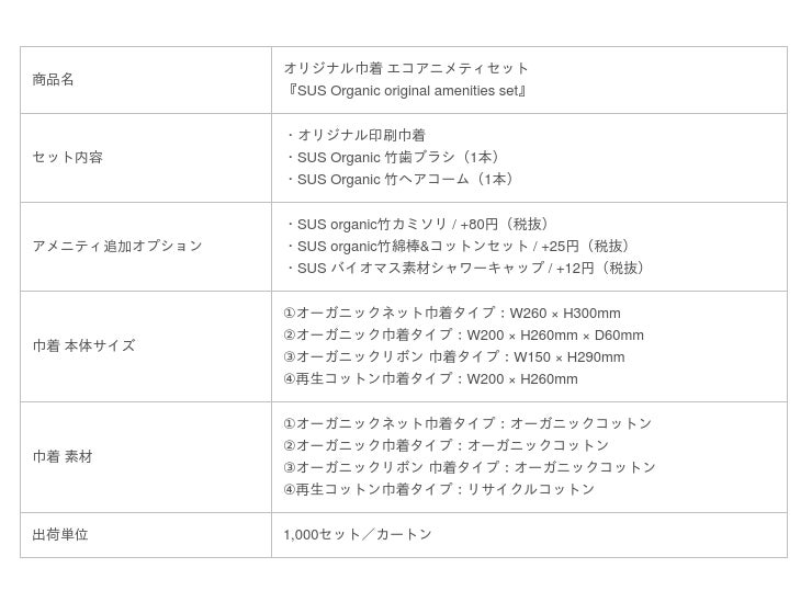 環境にやさしい素材を使用した巾着は、無地・ネット付き・リボン付きのオーガニックコットン、また再生コットンタイプの4種類から選べ、すべておもて面にオリジナルでロゴ印刷が可能です。中のアメニティはオプションで追加ができ、竹カミソリは+80円、竹綿棒&コットンセットは+25円、バイオマス素材シャワーキャップは+12円(全て税抜き)で展開しています。