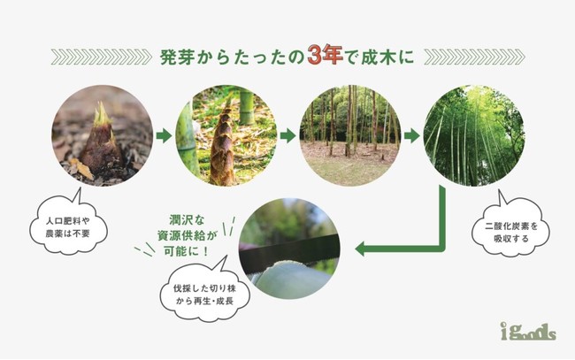 竹は栽培の際に人工肥料や農薬を必要とせず、発芽してからたったの3年で成木になります。成長期には一晩で一メートル以上も成長する生命力に溢れた植物です。また、伐採した切り株から新たに再生・成長するため買い替えが必要なく、土壌への負担もかかりません。