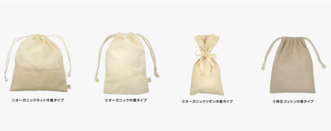 4種類のエコ巾着から選べ、オリジナルロゴ入れも可能!