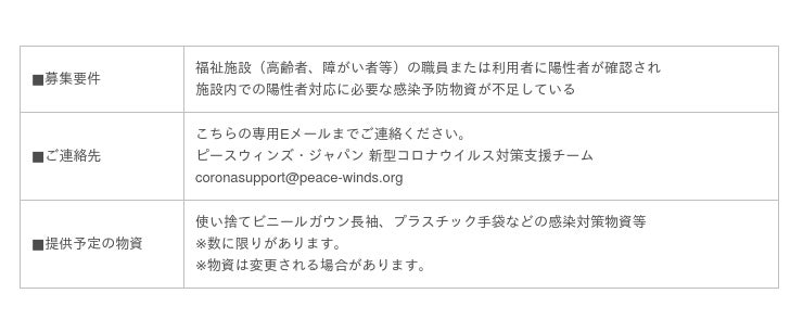認定NPOピースウィンズ・ジャパン(PWJ代表理事:大西健丞 本部:広島県神石高原町)は、新型コロナウイルス緊急支援として福祉施設へのクラスター支援に続き、陽性者対応を行う福祉施設へ物資を提供します。