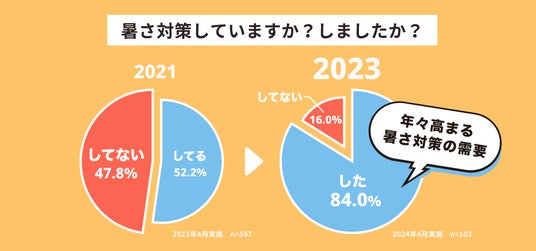 蒸し暑い日本の夏。2024年も猛暑が予想されています。赤ちゃんとのお出かけの暑さ対策をテーマにInstagramでアンケートを実施したところ、「暑さ対策をしている」と回答した方の割合は2021年に52.2%だったのに対し、2023年には84.0%まで増加。体温調節がまだ上手にできない赤ちゃんとの夏のお出かけにおいて、暑さ対策には高い関心が寄せられているのです。