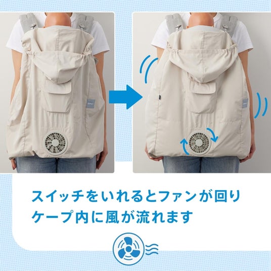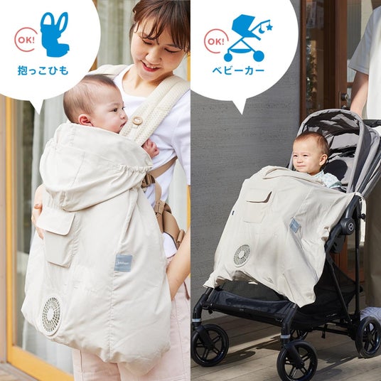 涼しく快適な抱っこが叶う画期的なベビーケープは、株式会社空調服のファン付きウェア「空調服(R)」との共同開発商品。2020年に発売して話題を集めた第一弾コラボの空調シリーズを、1枚で抱っこひもとベビーカー、どちらにも使えるようにアップデート。紫外線カット生地を使用しているので、春先から気になる日よけ対策も可能です。また、はっ水加工が施されているため、ジメジメとした雨の日にも活躍。オールインワンのベビーケープが、クールでスマートな夏のお出かけを実現します。
