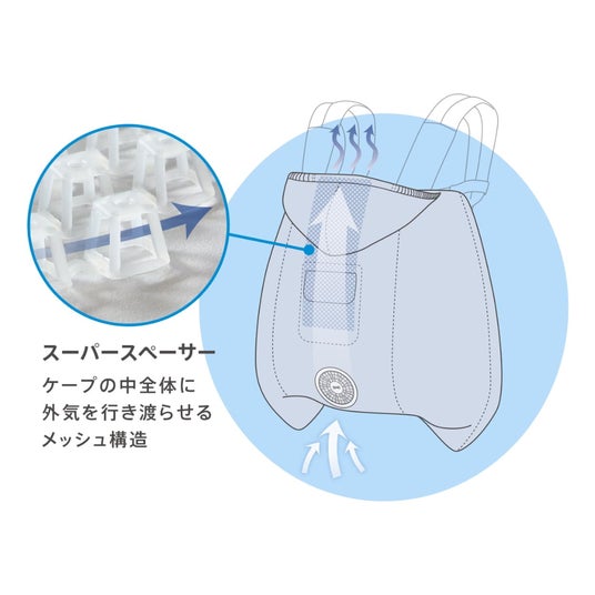 ベビーケープに付いたファン※1で取り込んだ空気がケープの中を流れ、首元から排出される過程で、赤ちゃんの汗を気化させて体を冷やすという仕組み。全体に風を行き渡らせる、メッシュ構造の「スーパースペーサー※2」がポイントです。風量を2段階で調整でき、野外では「強」、冷房のきいた屋内では「弱」など、暑さや場所に合わせてお使いいただけます。涼しく快適な状態を保てるベビーケープは、長時間のお出かけにもおすすめです。